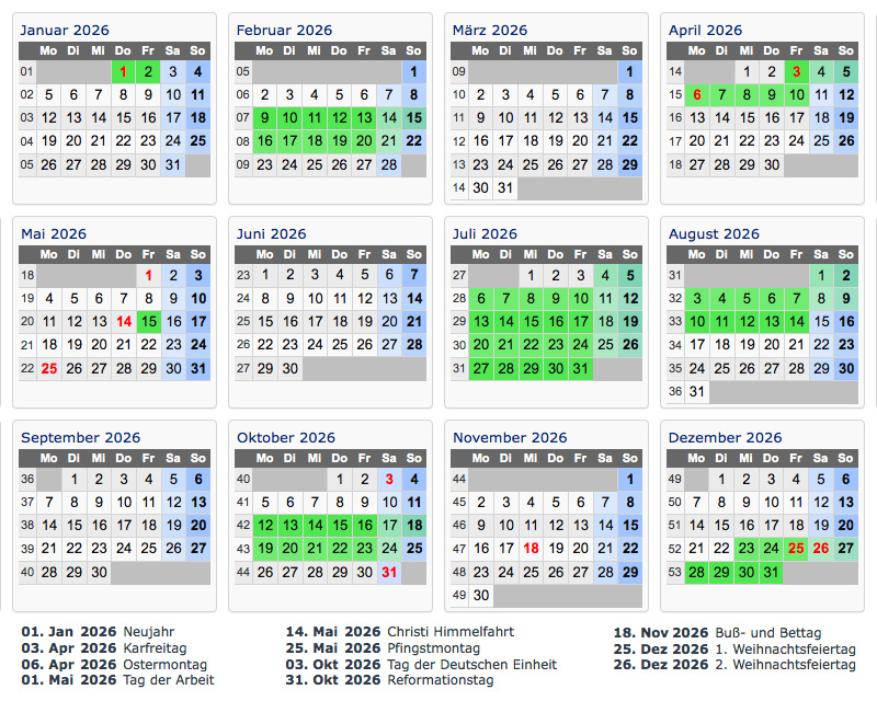 Gesetzl. Feiertage 2026 in Sachsen:. 11 Tage